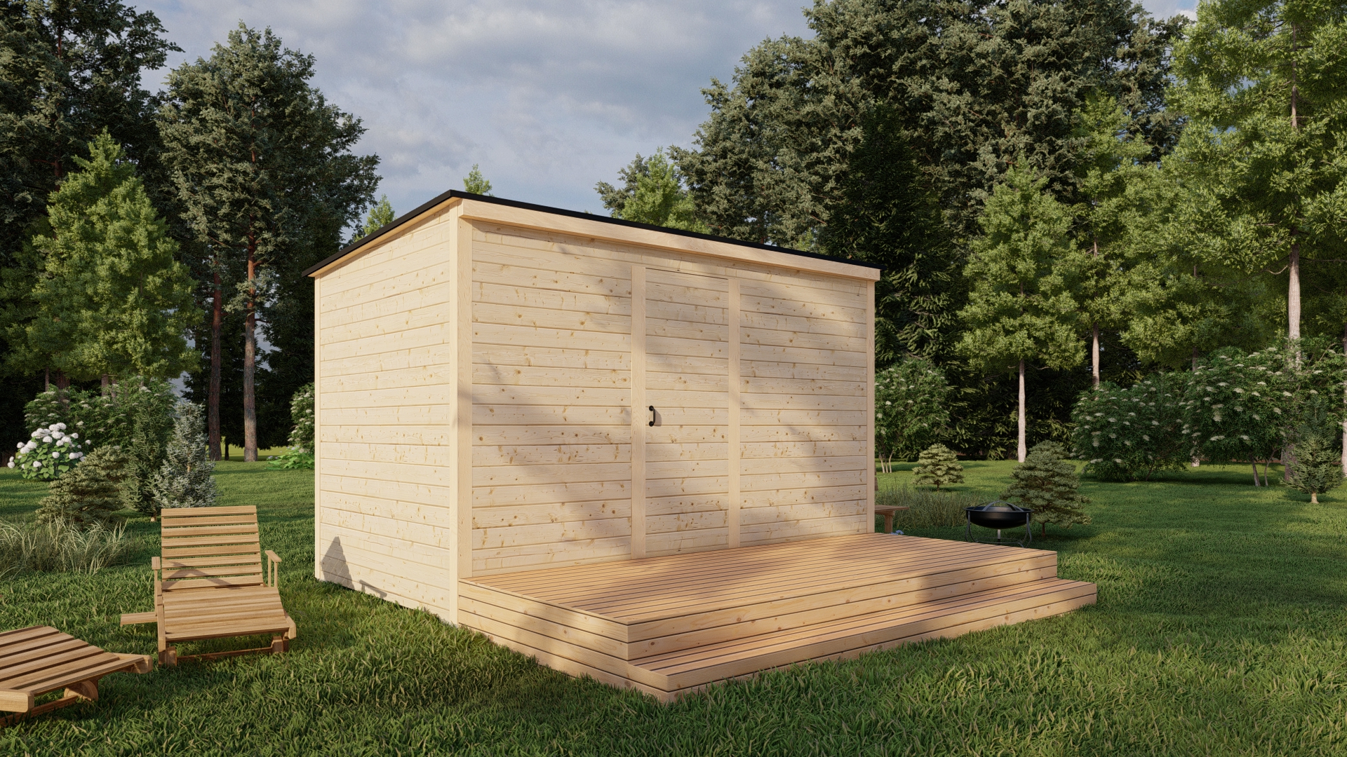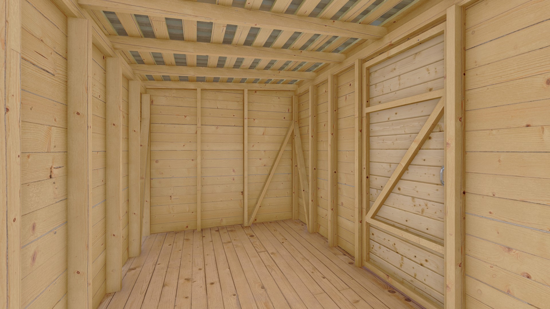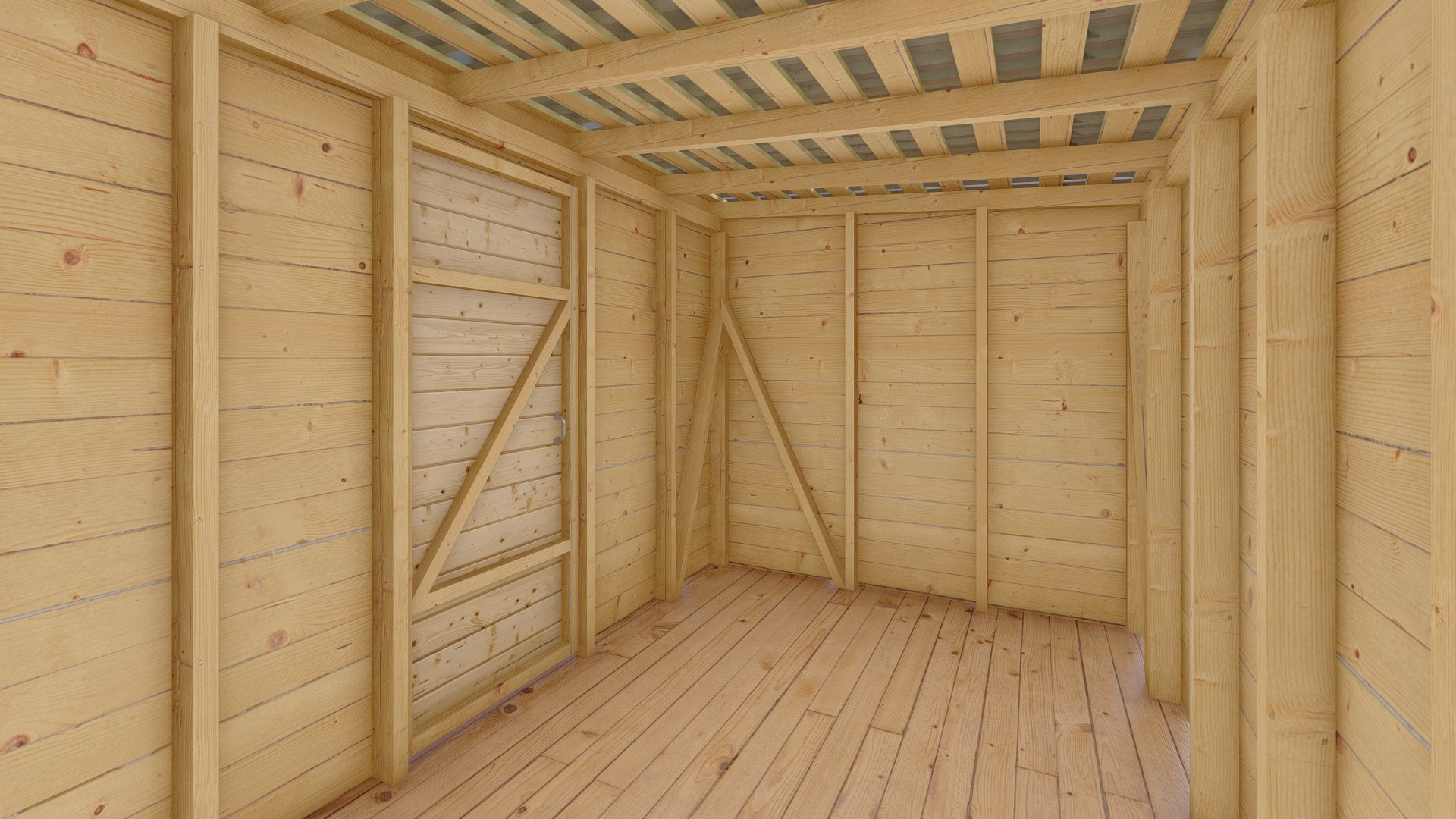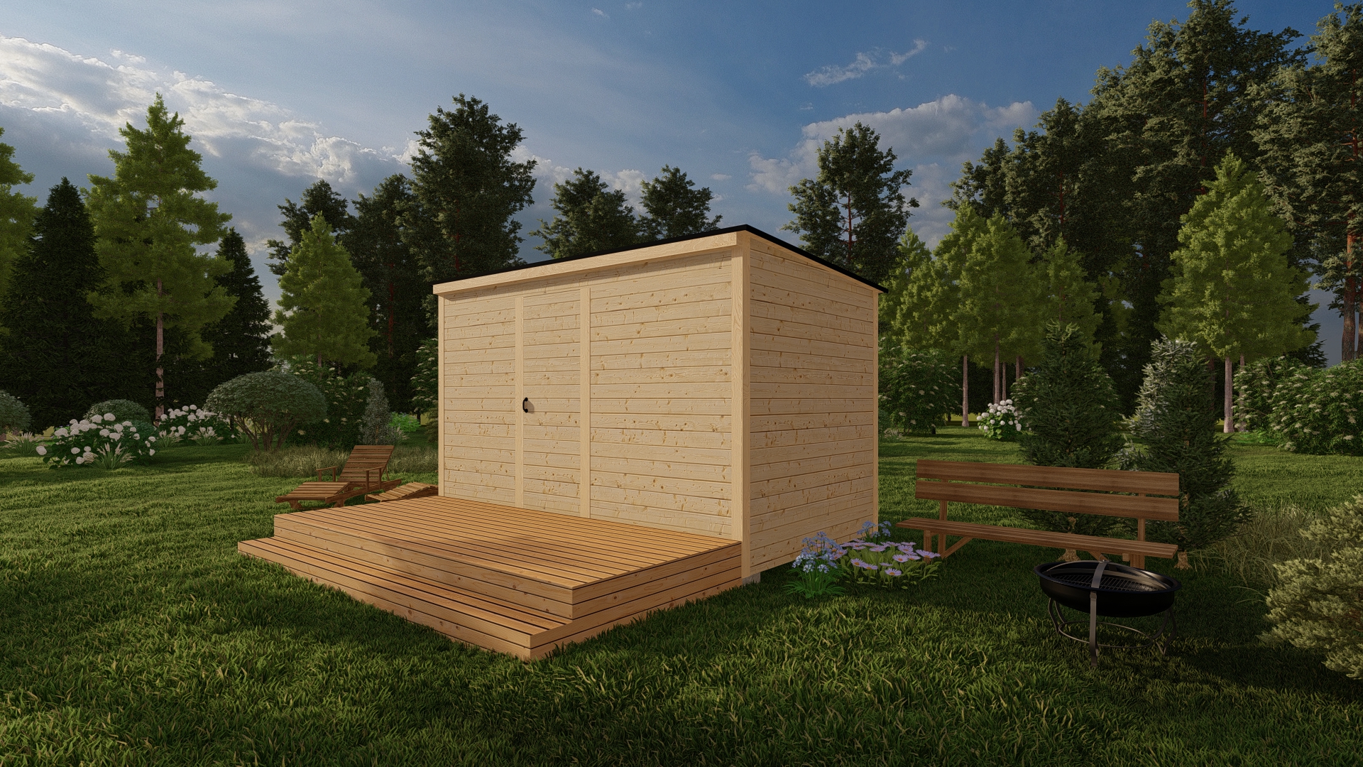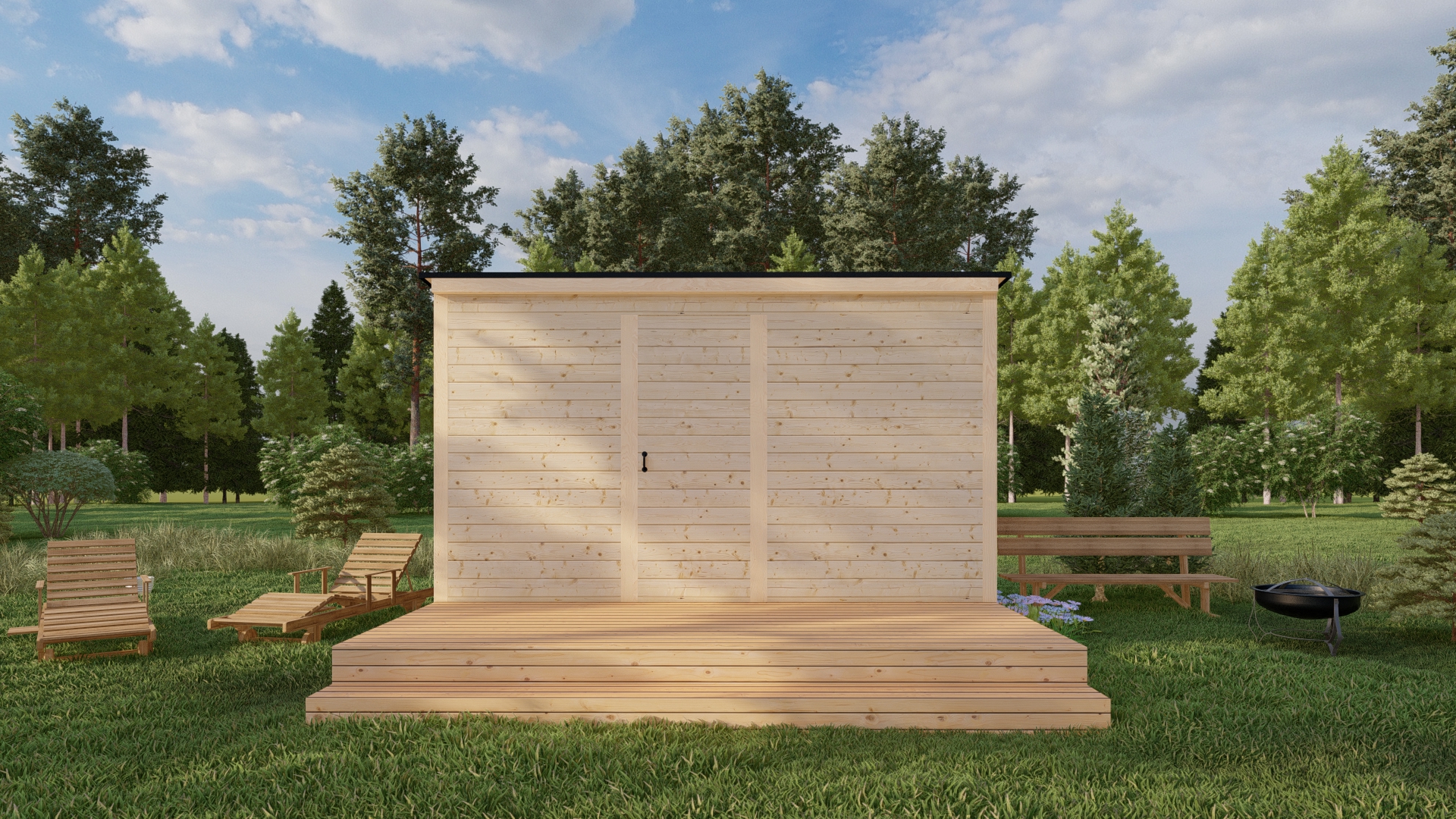 | Базовый вариант хозблока идет без утепления, крыша оцинкованный профлист. Снаружи вагонка "С" сорт, внутри без отделки, без окна, дверь дерево. |